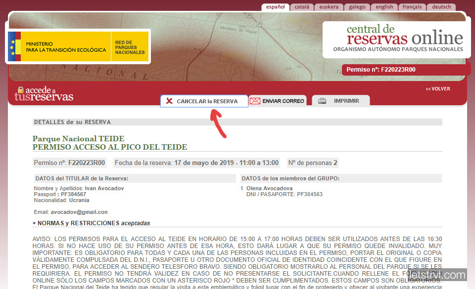 Стрелочкой отмечена кнопка отмены разрешения. Если ваши планы изменились и на пик Тейде вы больше не собираетесь, то советую отменить свое бронирование. Это освободит места для других путешественников.